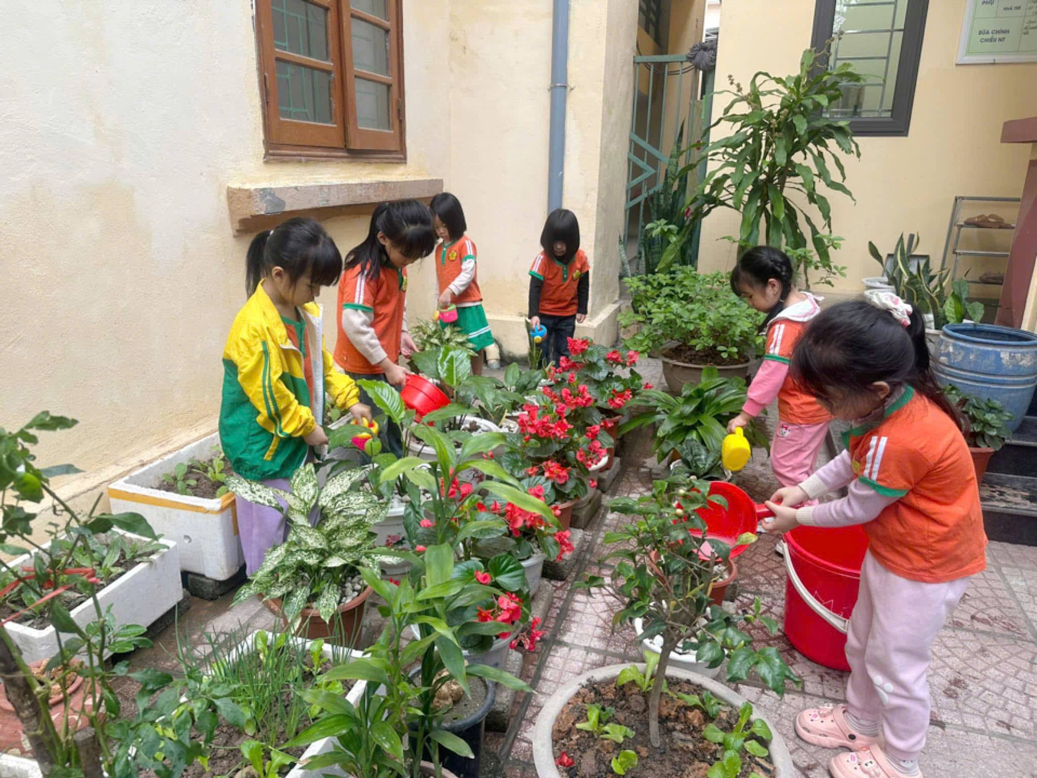 Trong không gian xanh mát của vườn hoa, những đôi bàn tay nhỏ xinh của các bé cẩn thận tưới nước cho từng chậu hoa, nâng niu từng chiếc lá. Xen lẫn những giọt mồ hôi là những nụ cười rạng rỡ, ánh mắt háo hức khi các con được trực tiếp chăm sóc cây và lắng nghe cô giáo trò chuyện, giới thiệu về các loại hoa trong vườn.