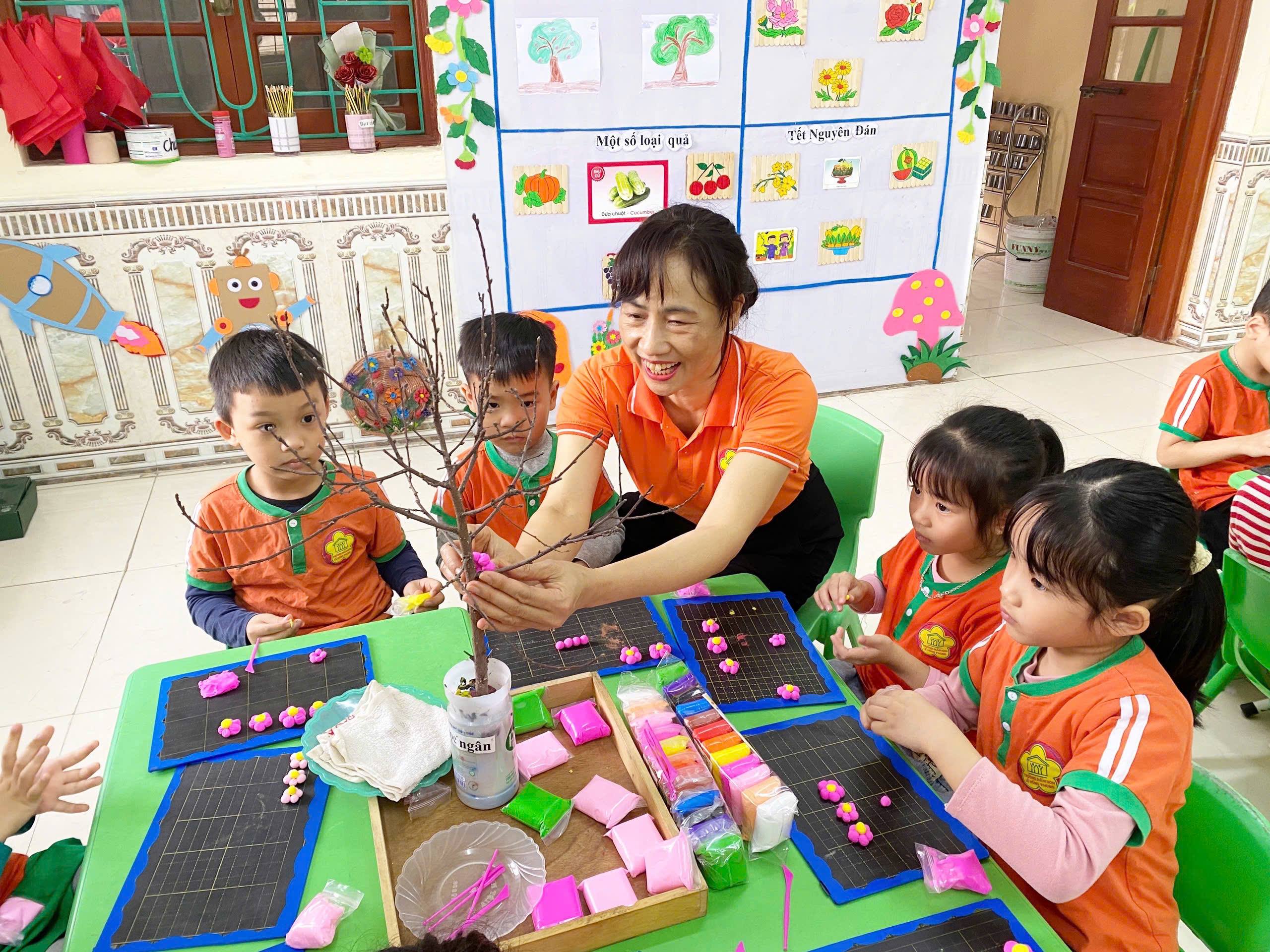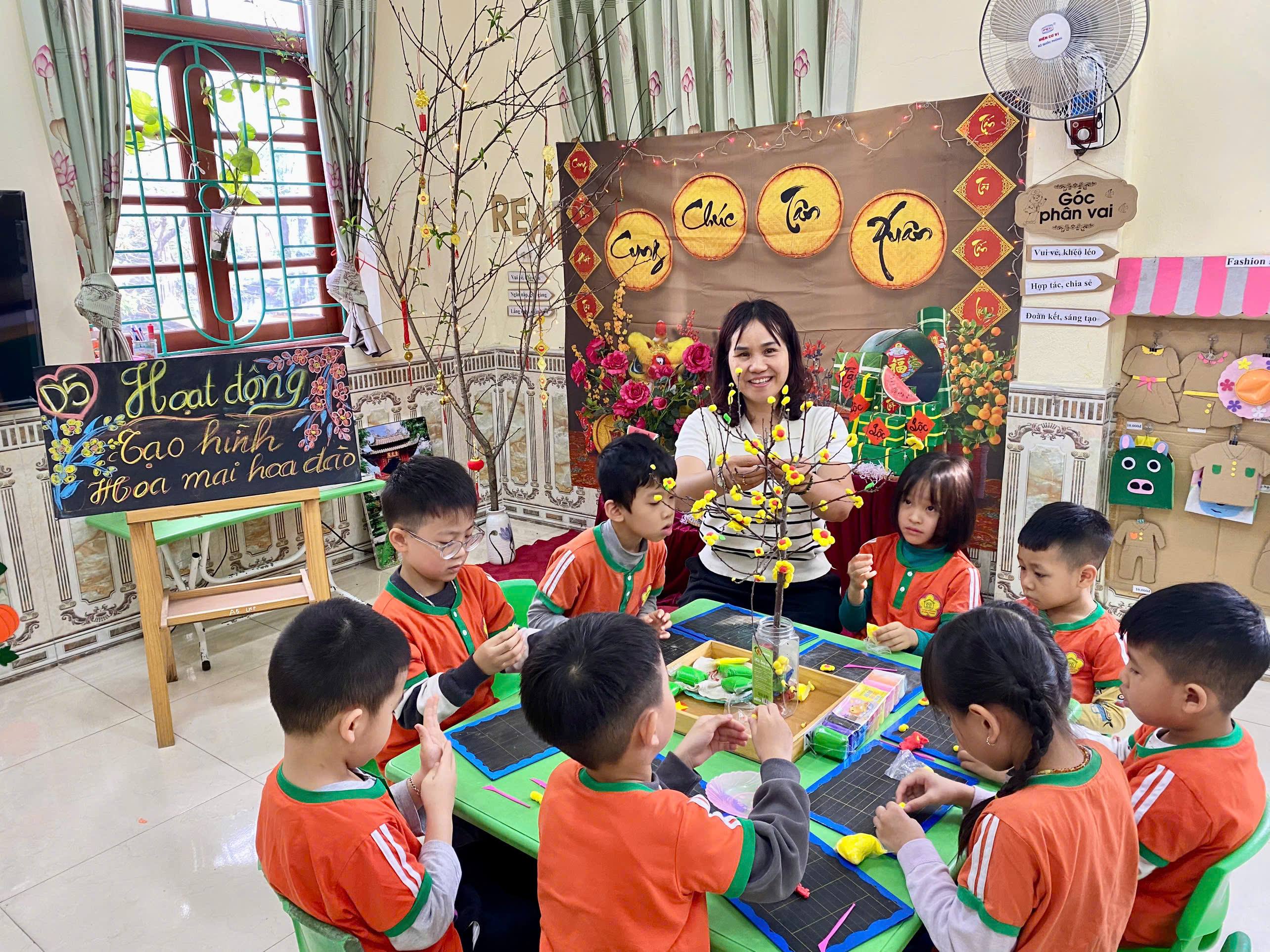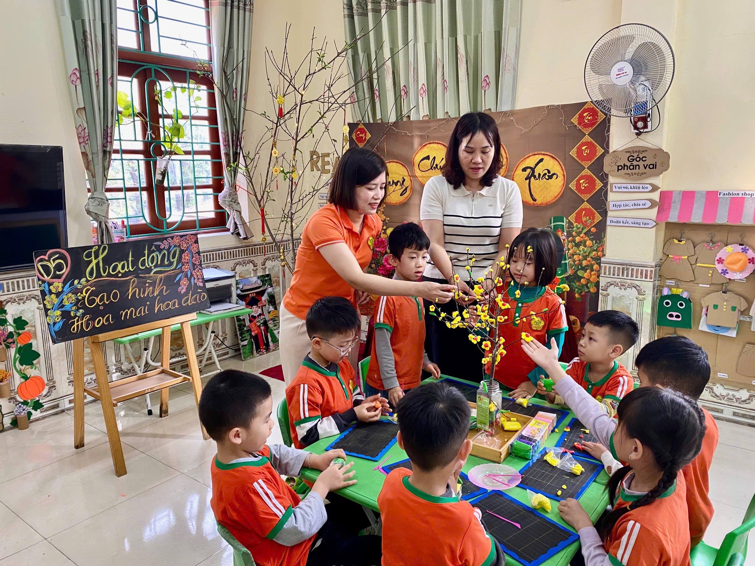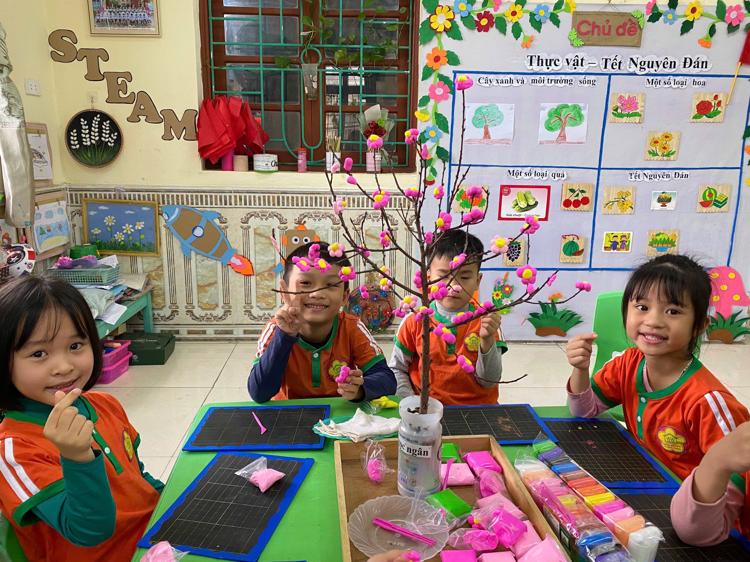 Hòa chung không khí ấy, các bé lớp D5 đã hào hứng tham gia hoạt động tạo hình “Hoa mai – hoa đào” với sự hướng dẫn tận tình của các cô giáo. Thông qua hoạt động, các bé được quan sát đặc điểm của từng loại hoa, biết lựa chọn màu sắc phù hợp và khéo léo sử dụng các nguyên vật liệu để tạo nên những bông hoa rực rỡ, sinh động.