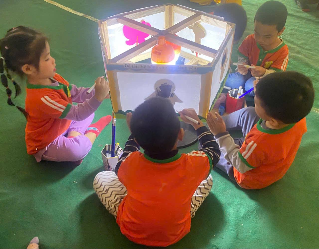 Hoạt động vẽ tranh theo bóng mang đến cho trẻ trải nghiệm tạo hình mới mẻ. Trẻ quan sát hình ảnh con vật được tạo ra từ ánh sáng chiếu qua khuôn hình, từ đó vẽ theo hình dáng bên ngoài của bóng đổ mà không cần thể hiện chi tiết bên trong. Điểm nổi bật của hoạt động là việc sử dụng màu đen hoặc màu đậm, giúp trẻ dễ nhận diện hình dáng con vật, rèn kỹ năng quan sát – ghi nhớ, phát huy trí tưởng tượng, tư duy sáng tạo và mạnh dạn thể hiện ý tưởng cá nhân.