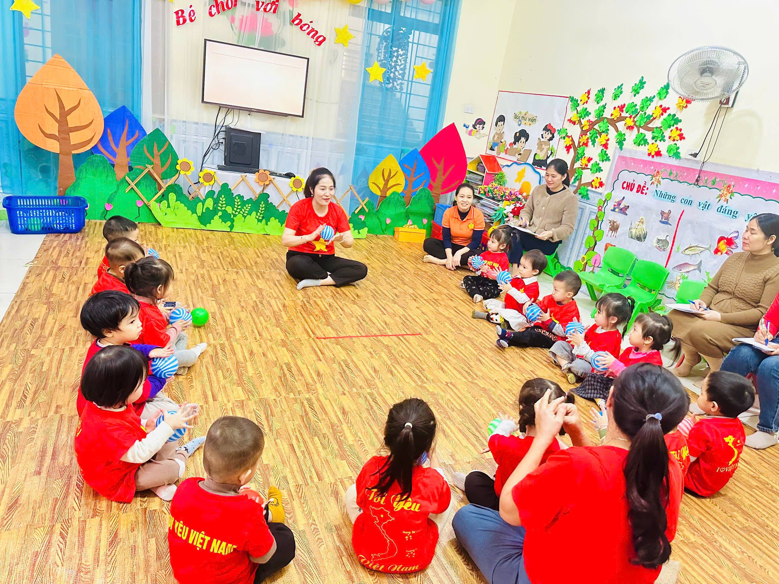 Đồ dùng đồ chơi phong phú, an toàn, phù hợp với lứa tuổi, trẻ được tự do khám phá, làm quen và chơi với bóng bằng nhiều hình thức khác nhau như: lăn bóng, thả bóng, chuyền bóng theo hướng dẫn của cô. Trong quá trình tổ chức hoạt động, cô giáo luôn quan tâm, động viên, khuyến khích trẻ tham gia, tạo cảm giác an toàn và hứng thú cho trẻ.
