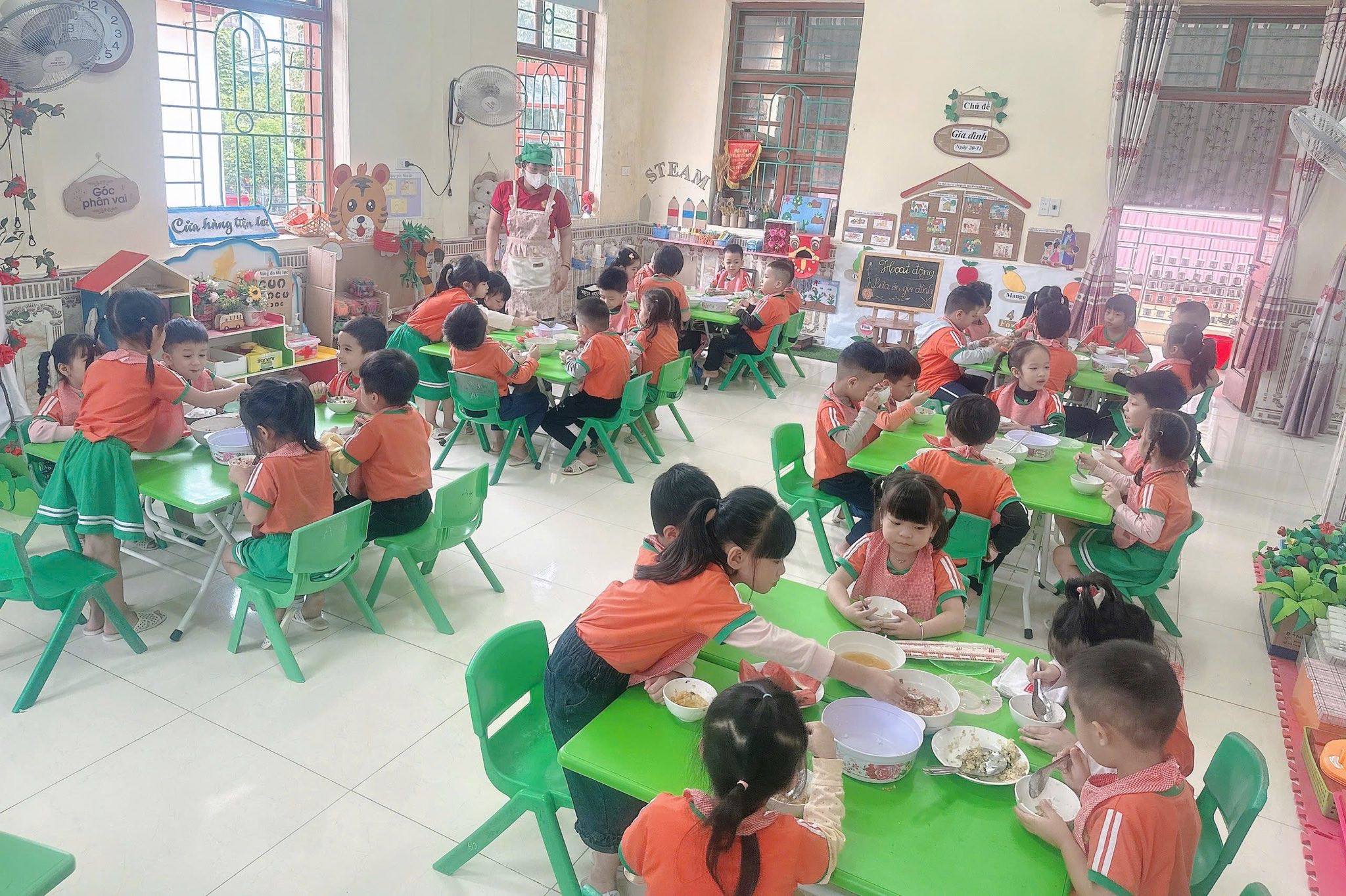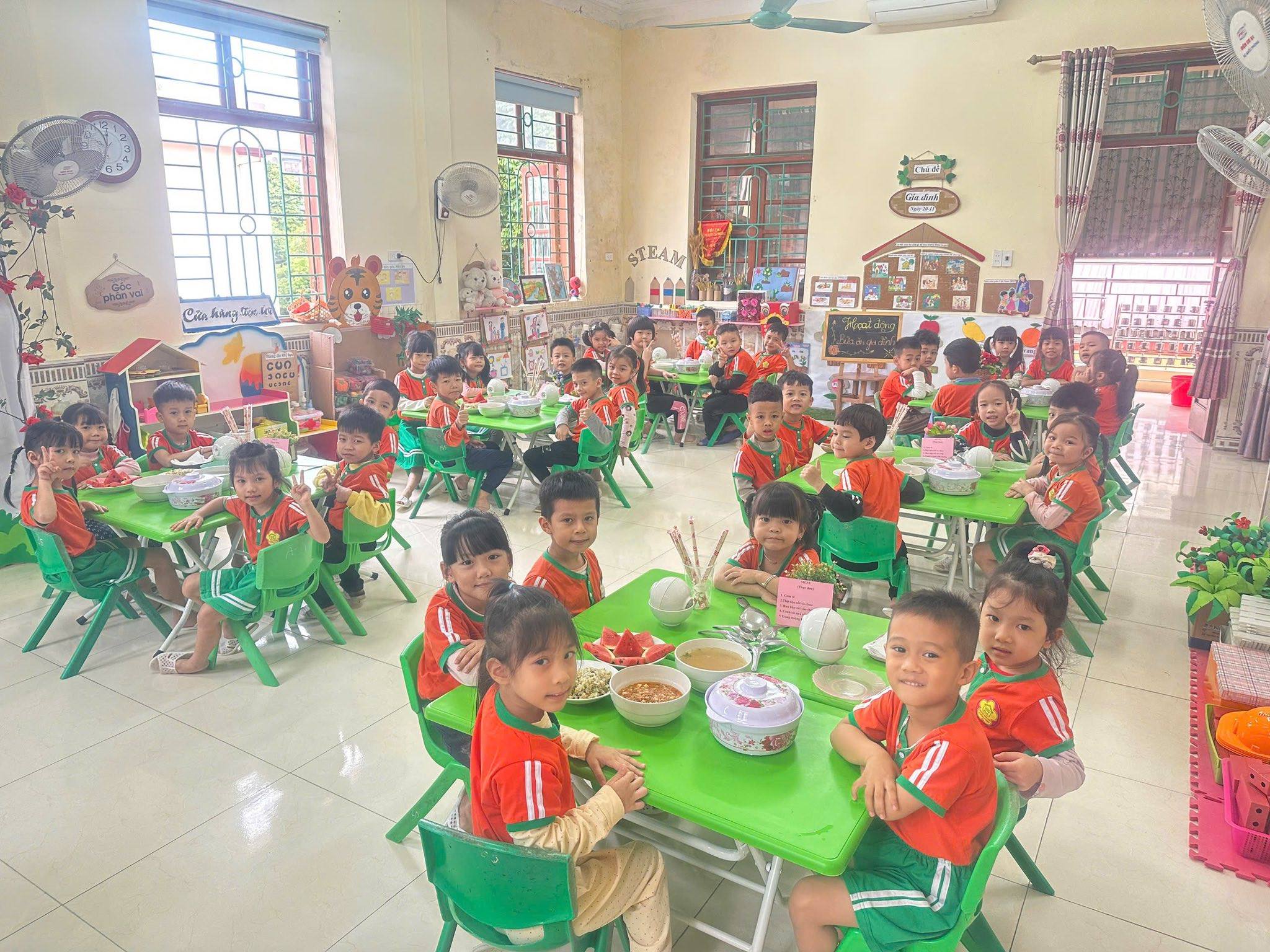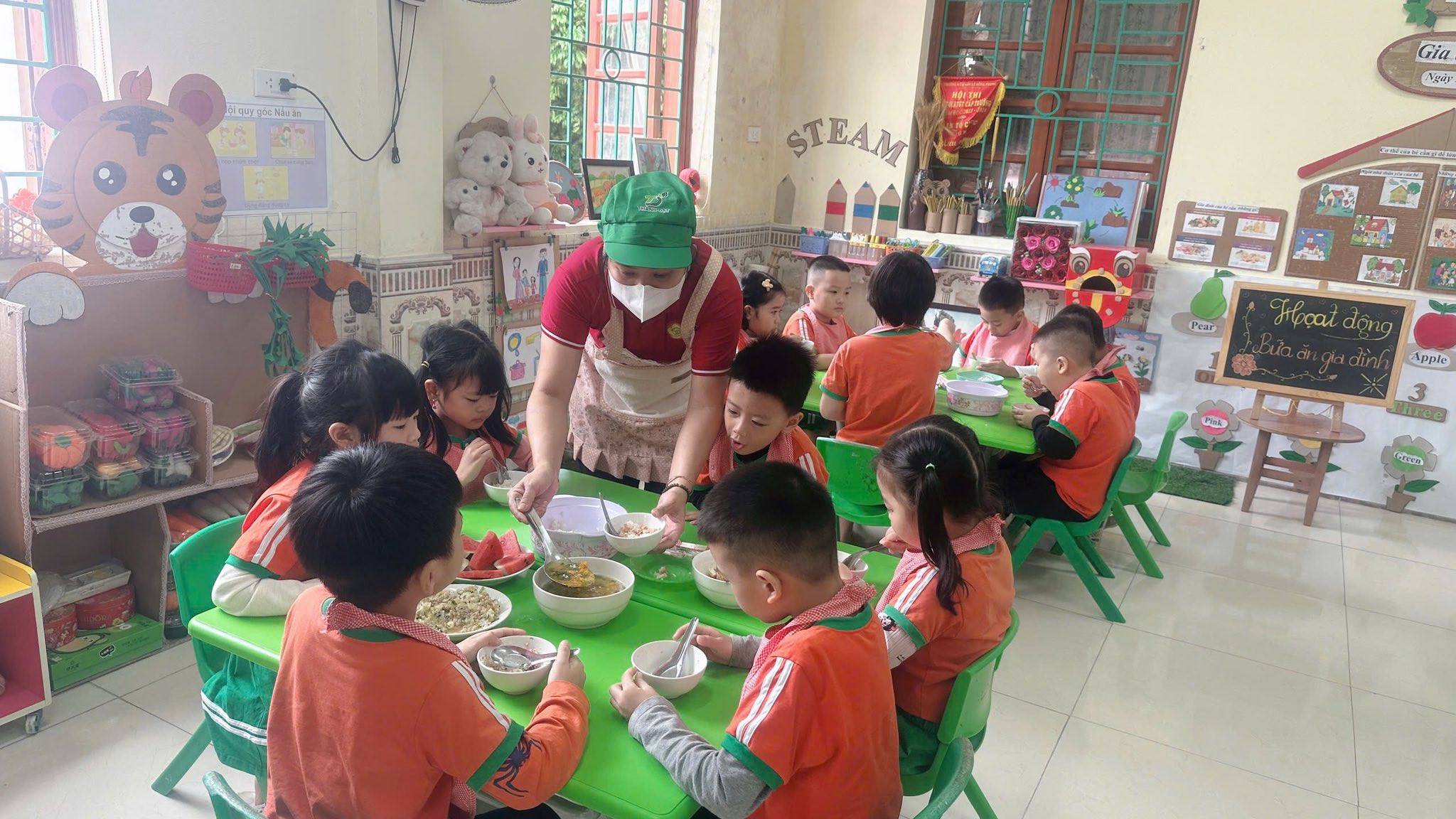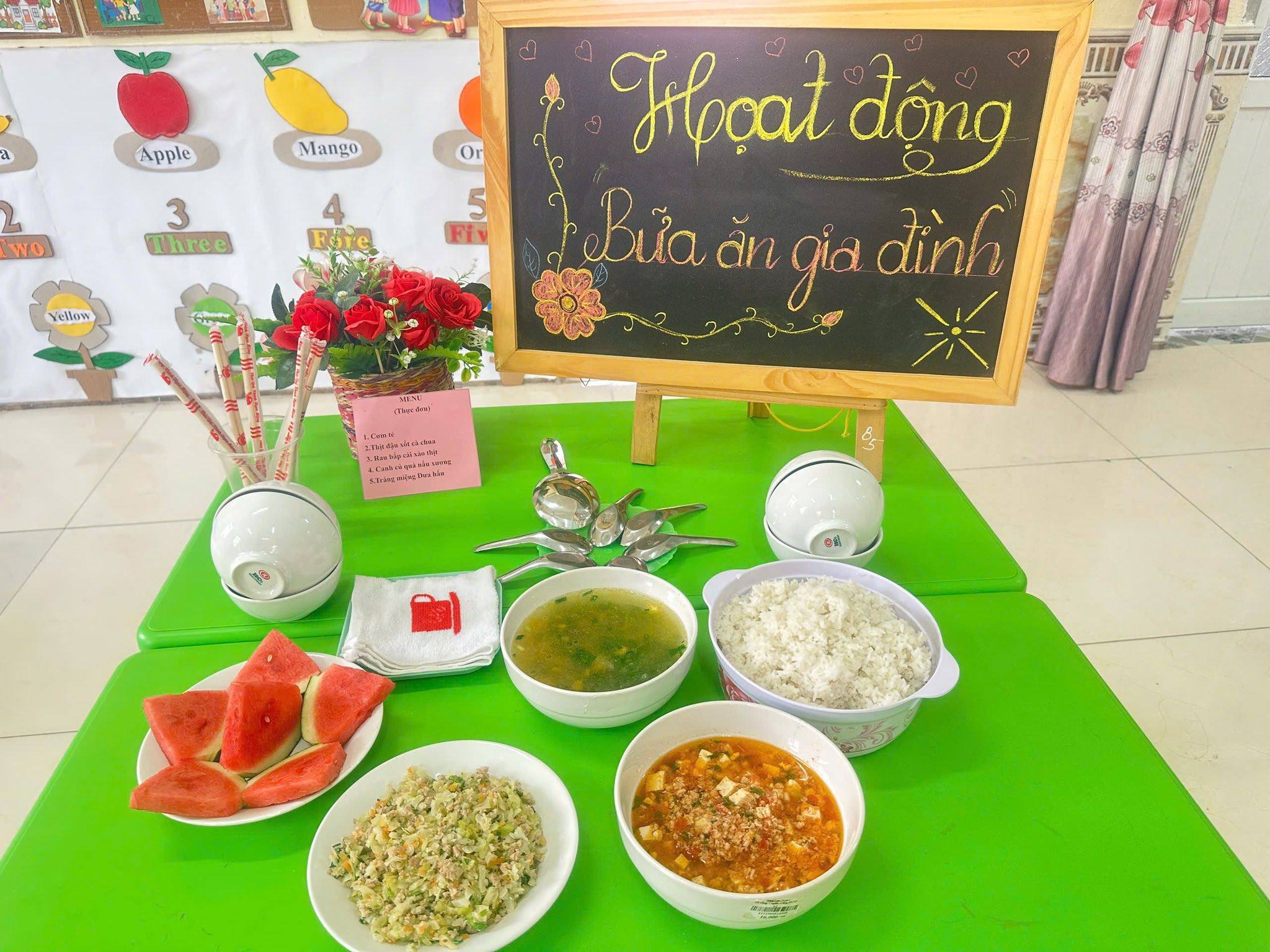 Bữa ăn gia đình tại trường mầm non gồm có các món mặn, món xào, món canh và tráng miệng
