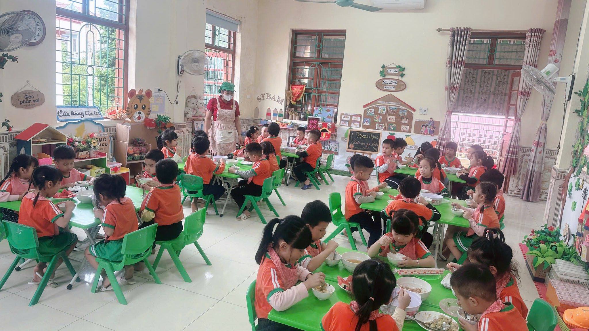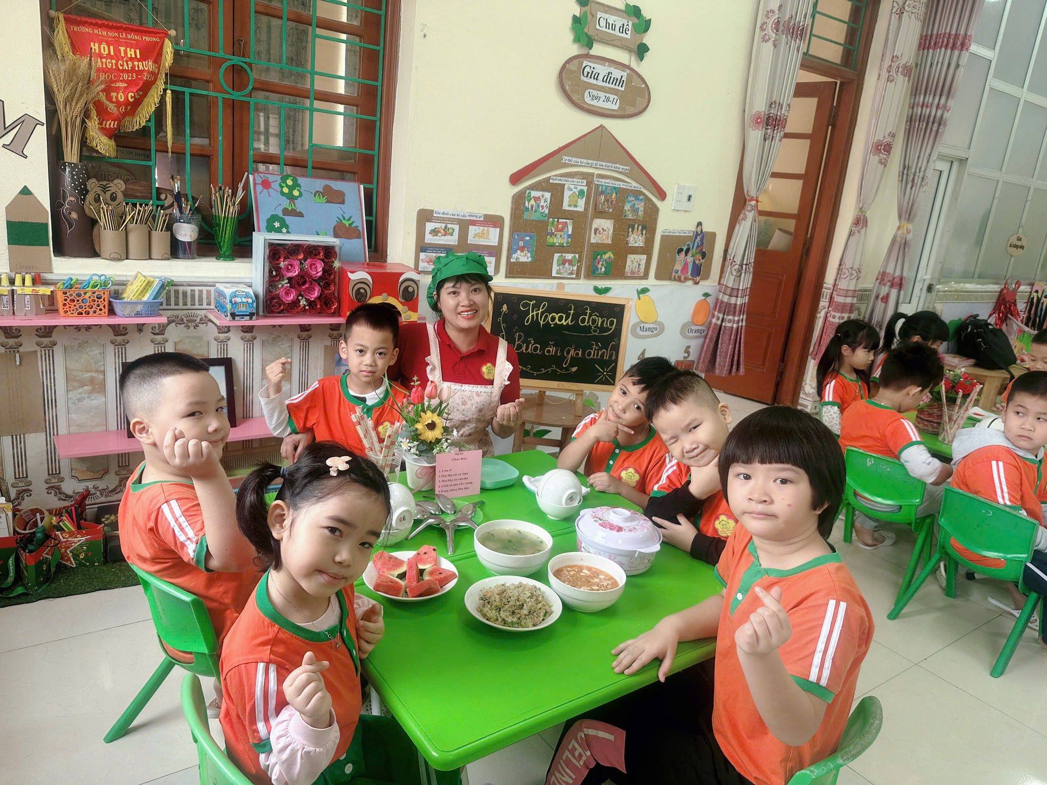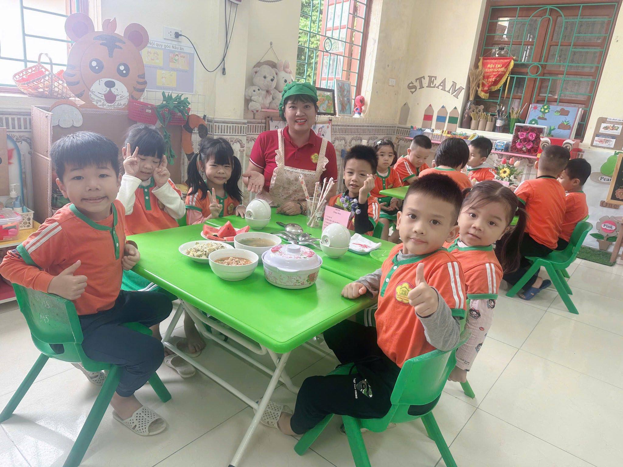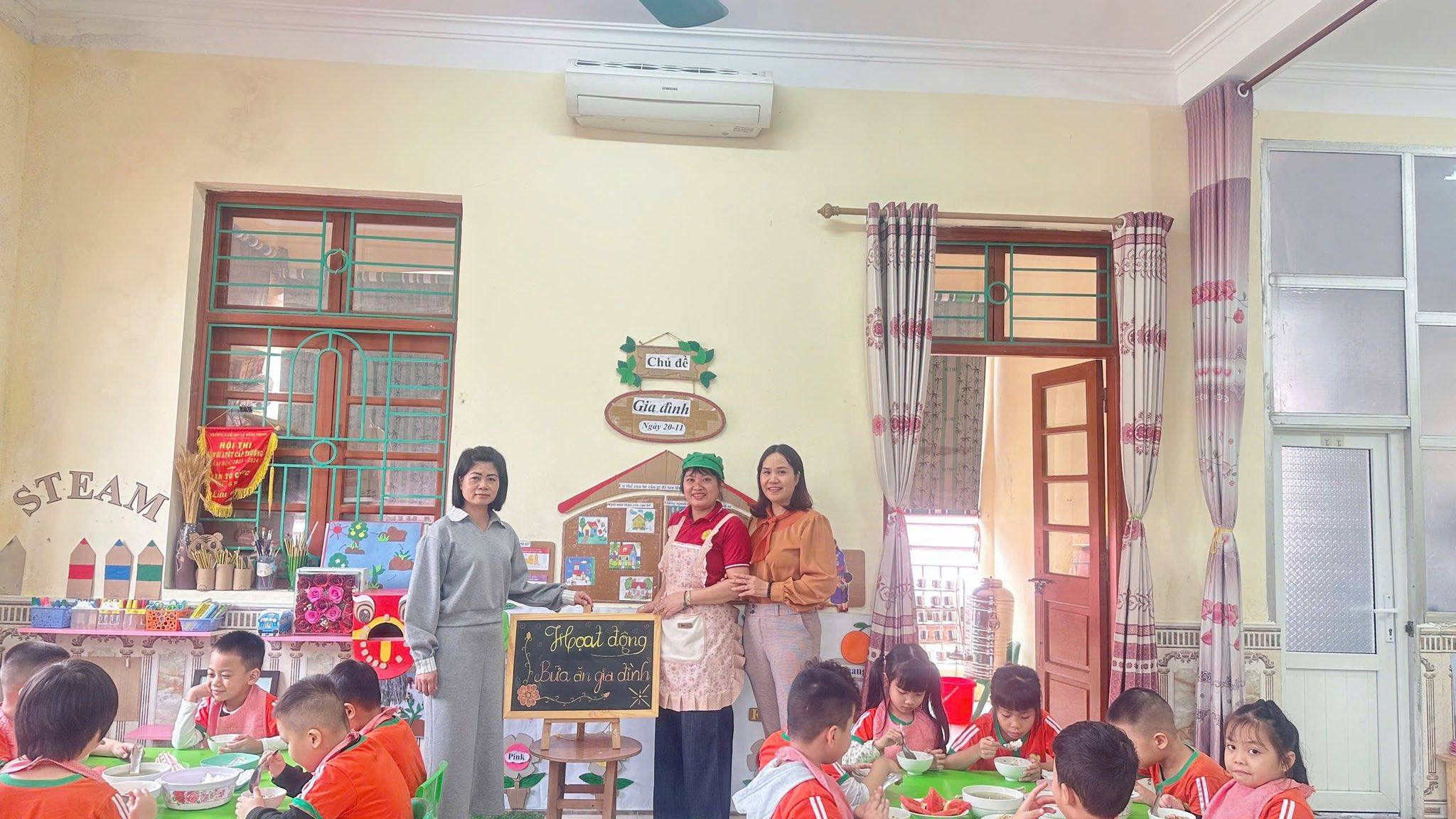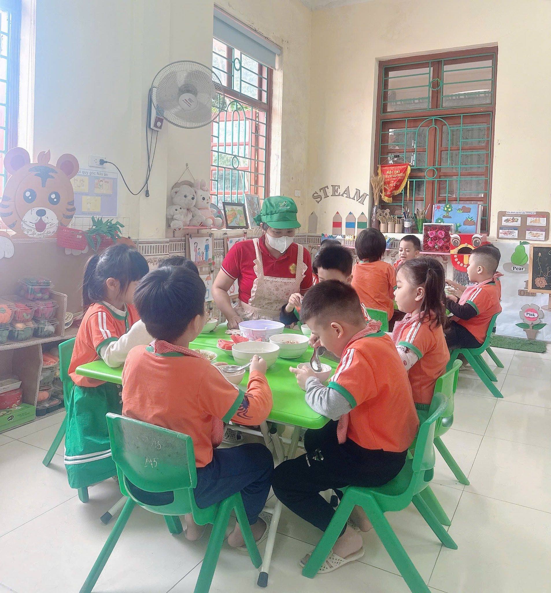 Bữa ăn gia đình tại trường mầm non gồm có các món mặn, món xào, món canh và tráng miệng