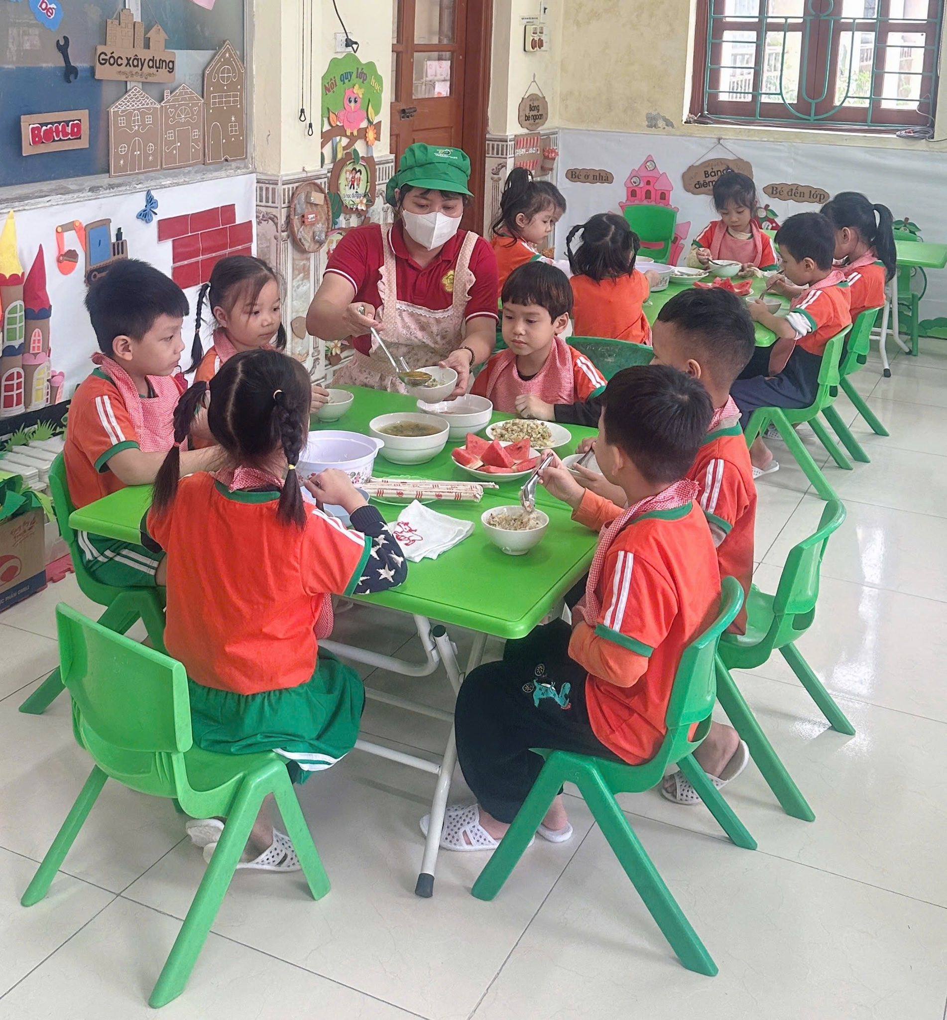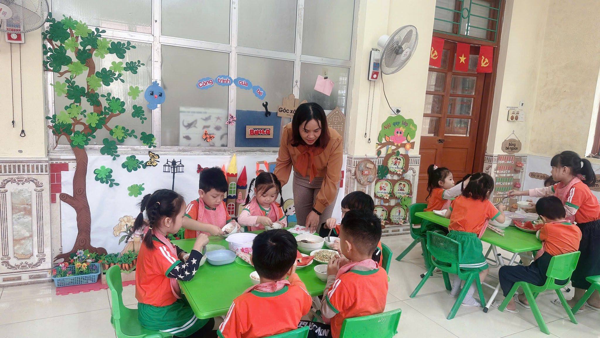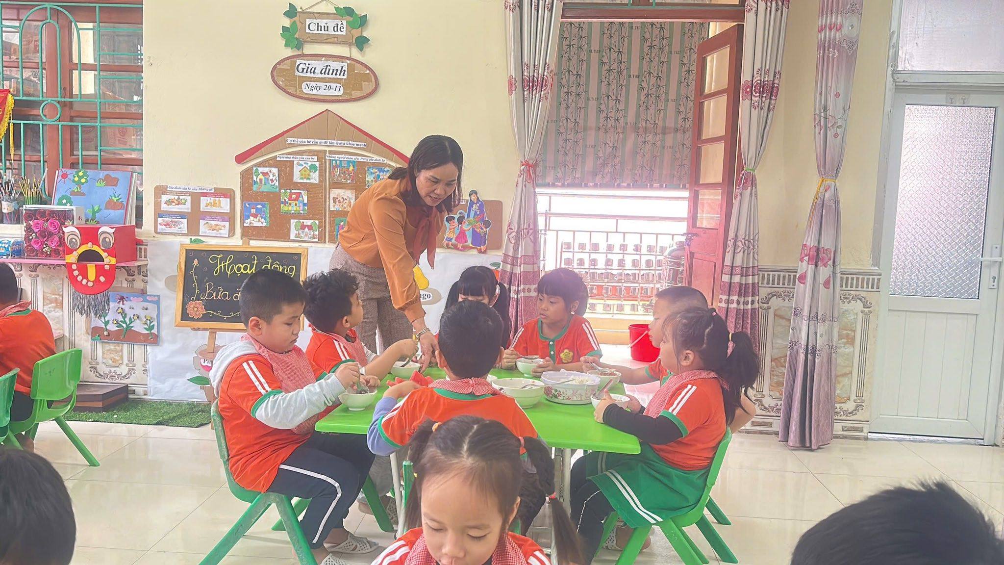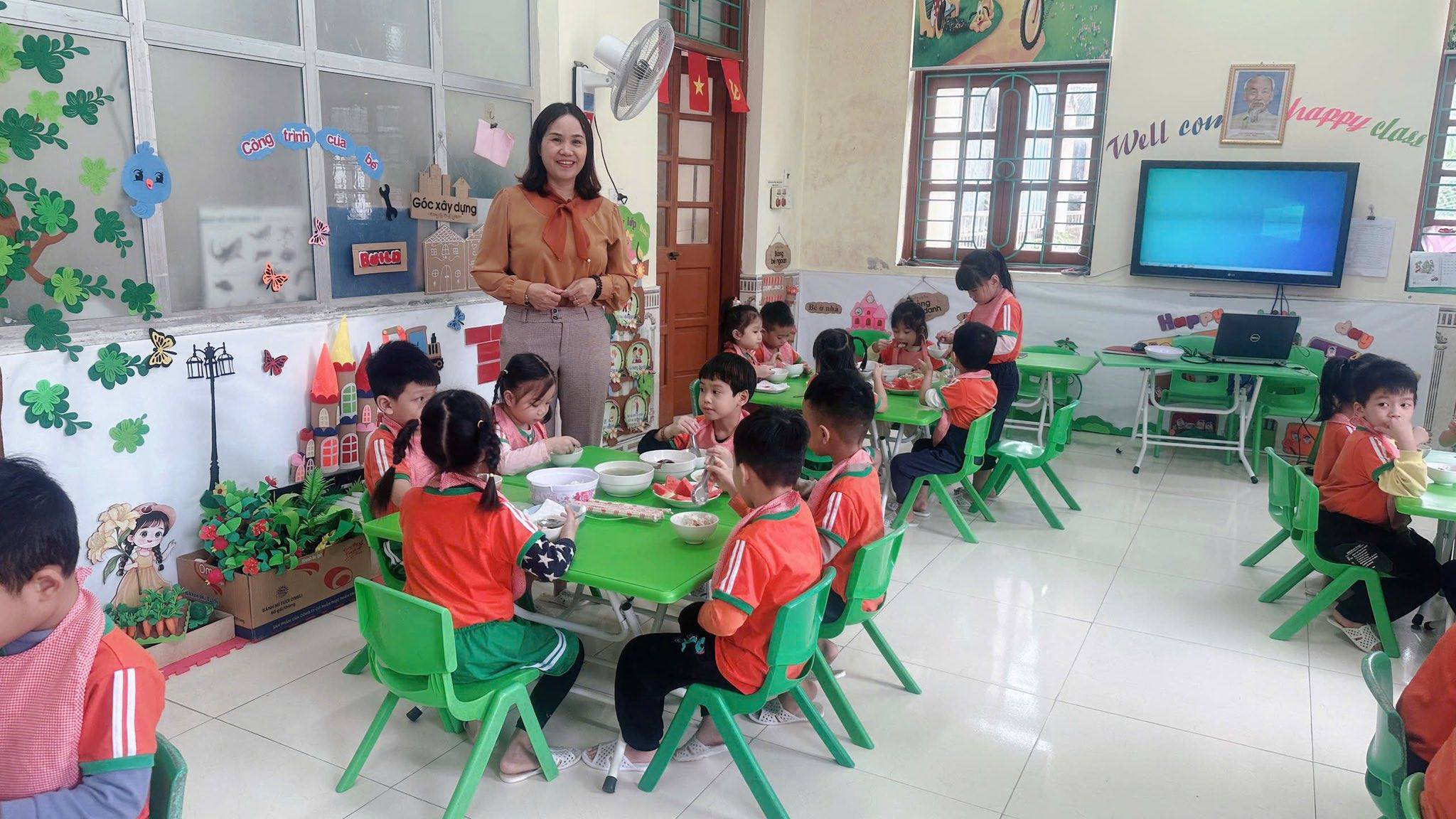 Bữa ăn gia đình tại trường mầm non gồm có các món mặn, món xào, món canh và tráng miệng