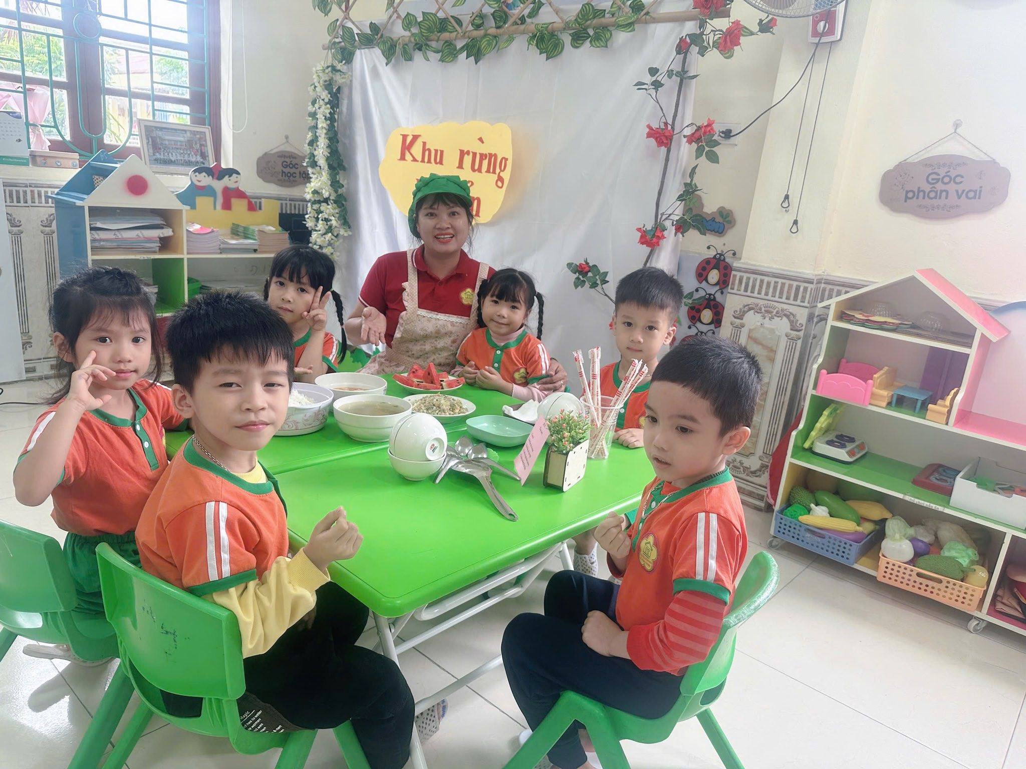 , trẻ được tự lựa chọn thức ăn và ăn theo sở thích của mình. Tại bữa ăn trẻ được trải nghiệm cách tự lấy cơm, tự lấy thức ăn, và cả lấy thức ăn cho bạn; được sử dụng đũa để gắp thức ăn và cùng mời các bạn ăn cơm… Trẻ được trải nghiệm văn hóa trong ăn uống, văn hóa ứng xử trong bữa ăn, không khí ấm áp thân thương của gia đình